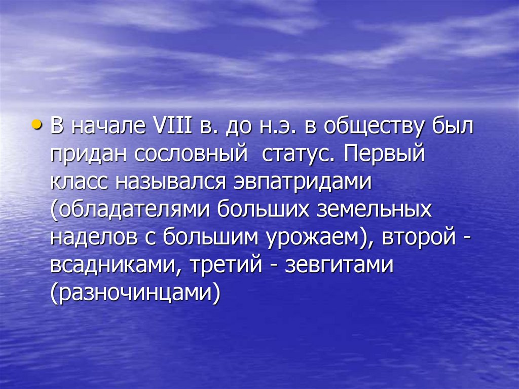 • В начале VIII в. до н.э. в обществу былпридан сословный статус. Первый
