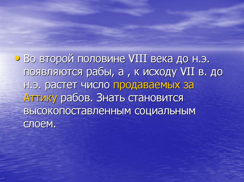 • Во второй половине VIII века до н.э.появляются рабы, а , к исходу VII в. до