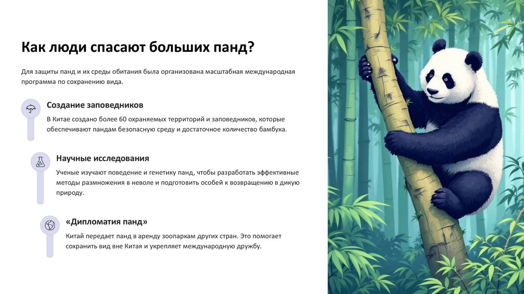 Как люди спасают больших панд?Для защиты панд и их среды обитания была организована масштабная международная