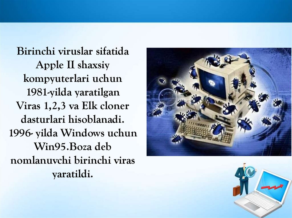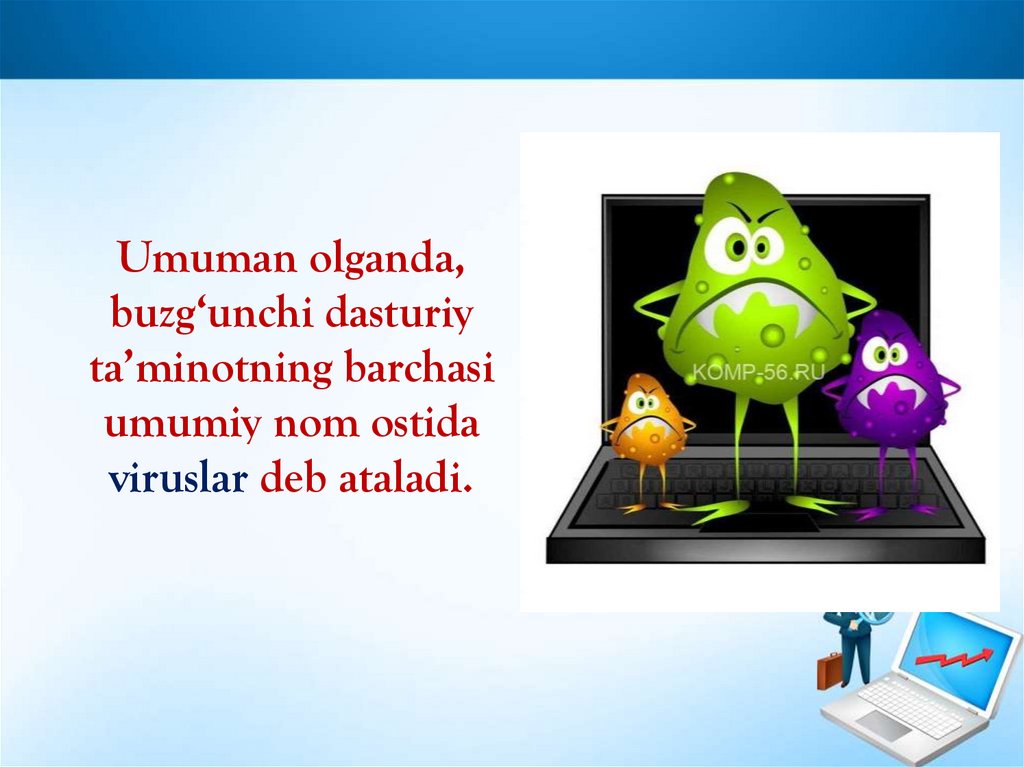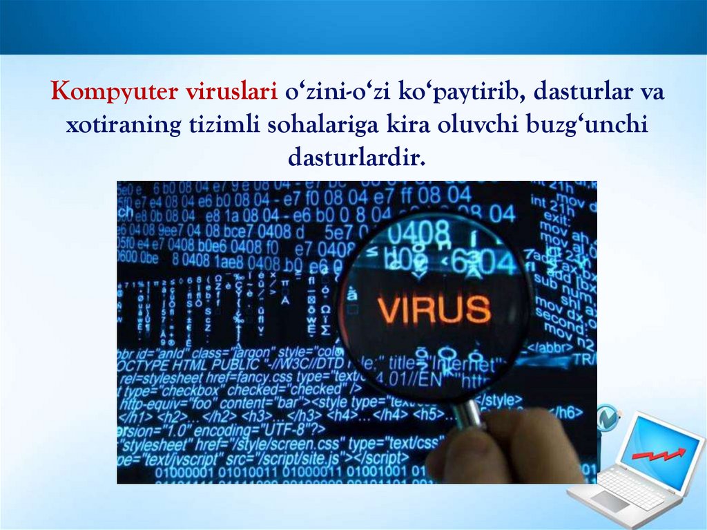 Kompyuter viruslari o‘zini-o‘zi ko‘paytirib, dasturlar vaxotiraning tizimli sohalariga kira oluvchi buzg‘unchi