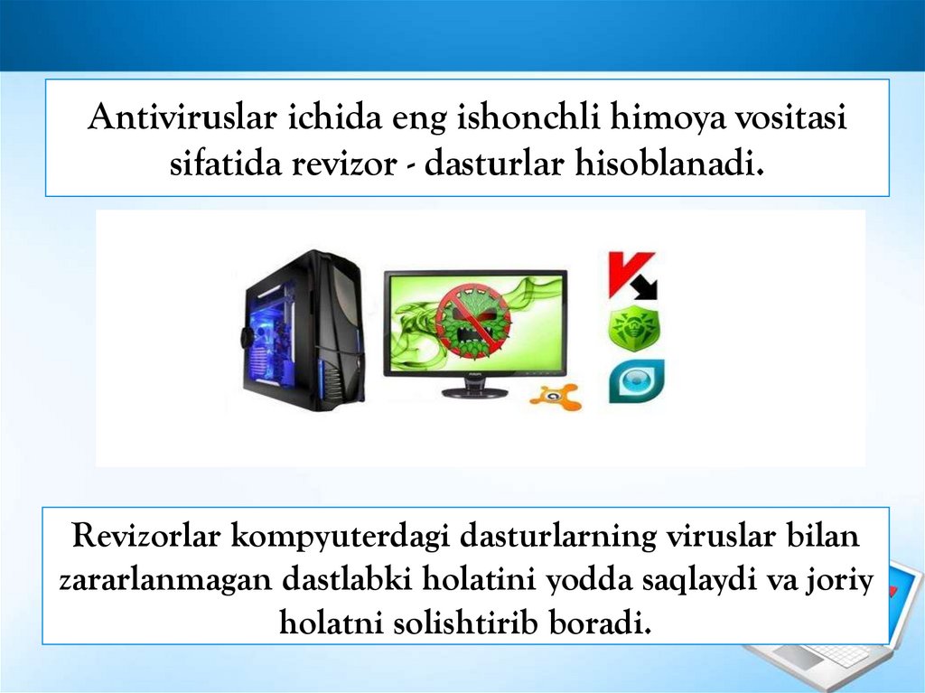 Antiviruslar ichida eng ishonchli himoya vositasisifatida revizor - dasturlar hisoblanadi.