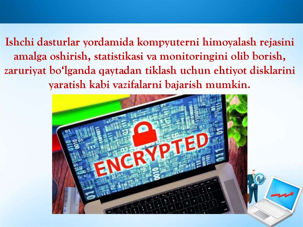 Ishchi dasturlar yordamida kompyuterni himoyalash rejasiniamalga oshirish, statistikasi va monitoringini olib borish,