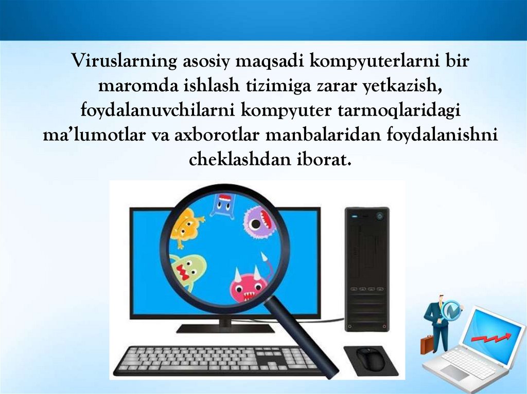 Viruslarning asosiy maqsadi kompyuterlarni birmaromda ishlash tizimiga zarar yetkazish,