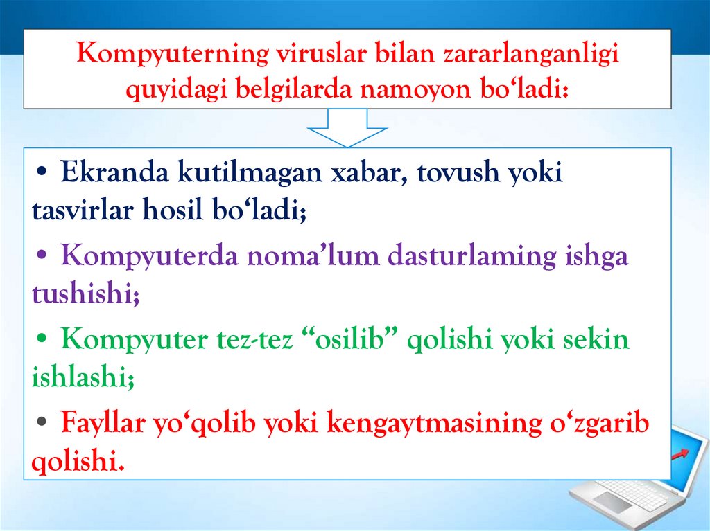 Kompyuterning viruslar bilan zararlanganligiquyidagi belgilarda namoyon bo‘ladi: