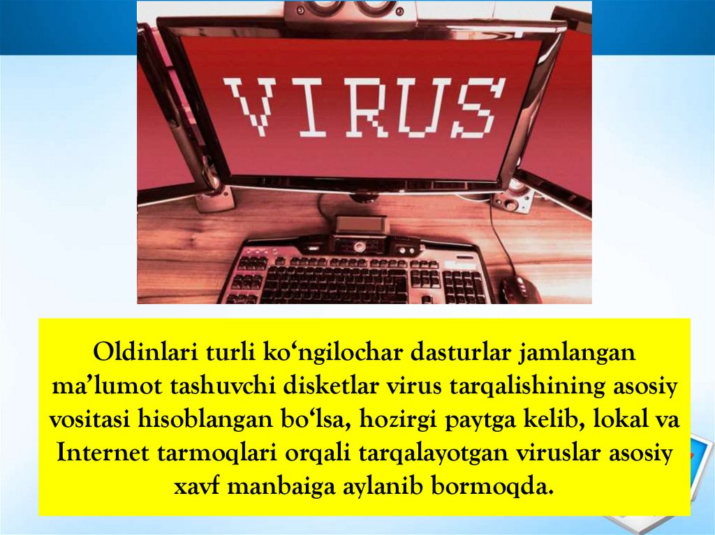 Oldinlari turli ko‘ngilochar dasturlar jamlanganma’lumot tashuvchi disketlar virus tarqalishining asosiy