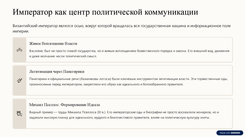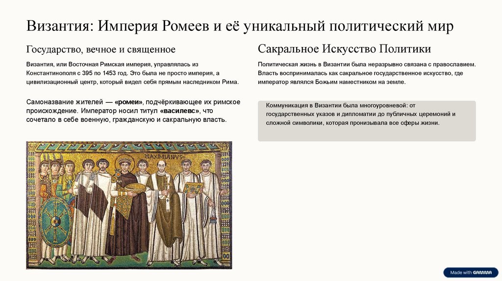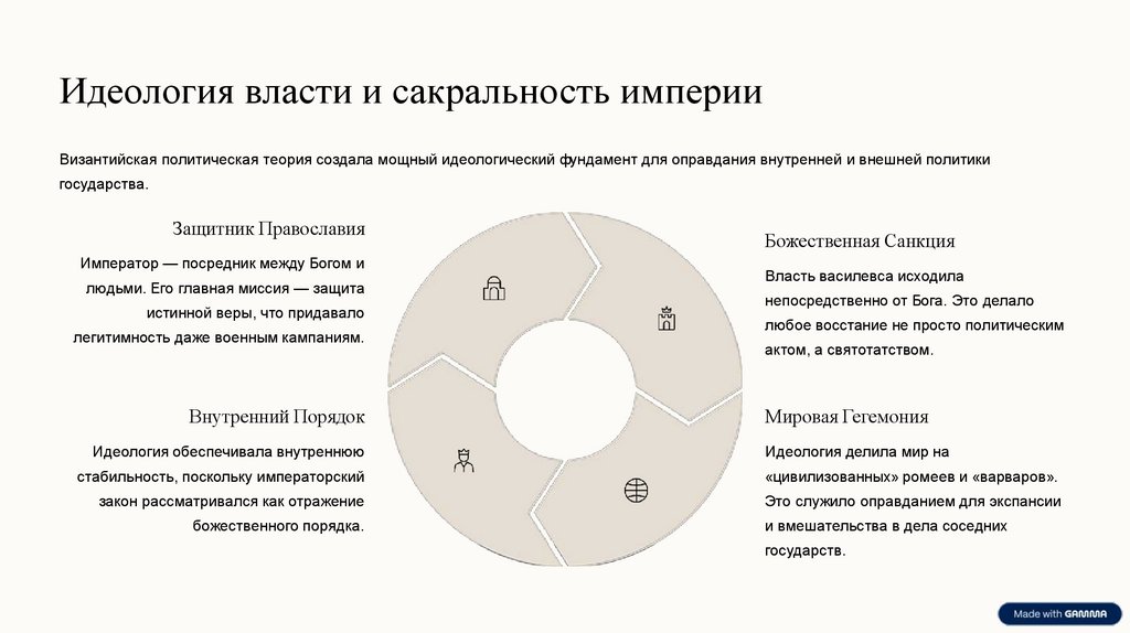 Идеология власти и сакральность империиВизантийская политическая теория создала мощный идеологический фундамент для оправдания внутренней и внешней политики