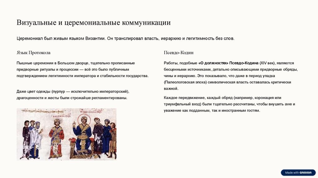 Визуальные и церемониальные коммуникацииЦеремониал был живым языком Византии. Он транслировал власть, иерархию и легитимность без слов.
