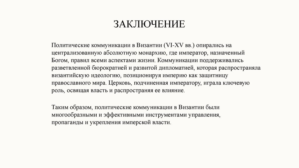 ЗАКЛЮЧЕНИЕПолитические коммуникации в Византии (VI-XV вв.) опирались на