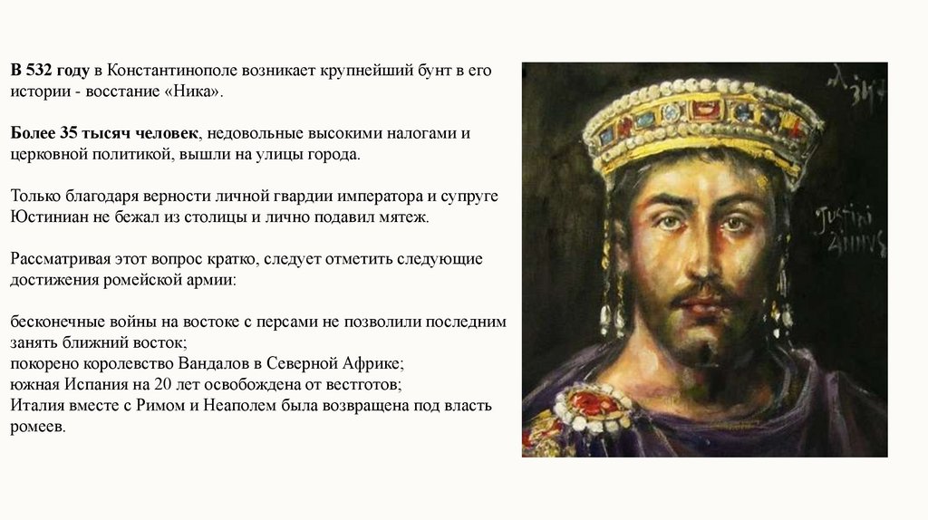 Юстиниан не бежал из столицы и лично подавил мятеж.