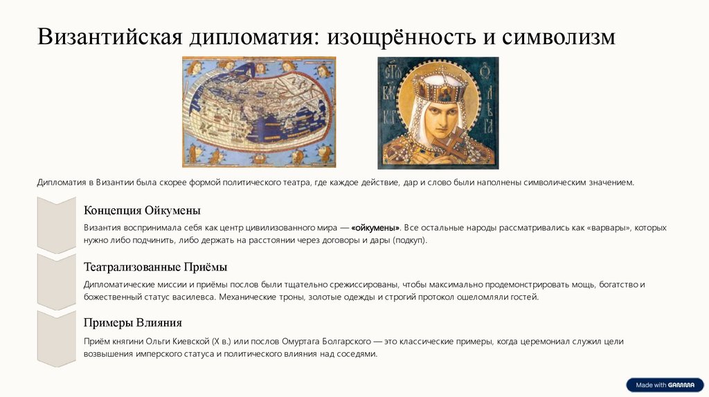 Византийская дипломатия: изощрённость и символизмДипломатия в Византии была скорее формой политического театра, где каждое действие, дар и слово были наполнены символическим значением.