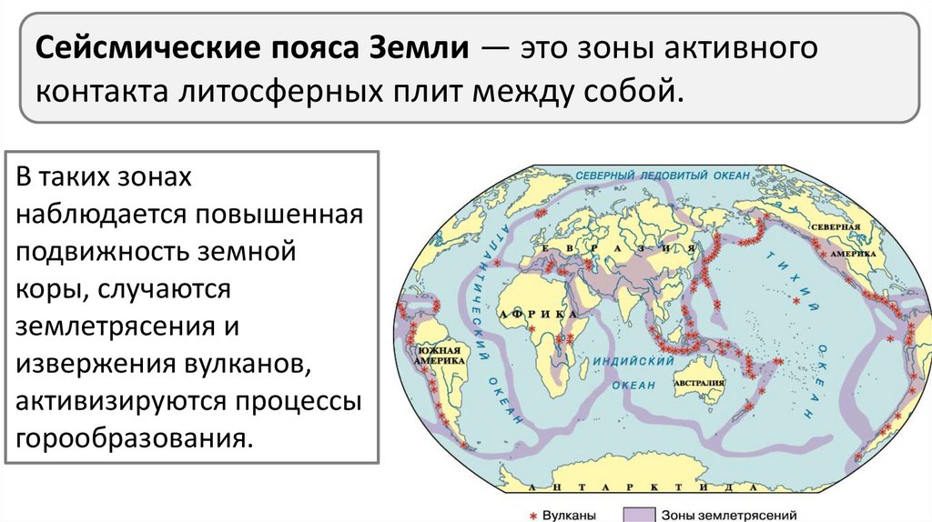 Сейсмические пояса Земли — это зоны активногоконтакта литосферных плит между собой.