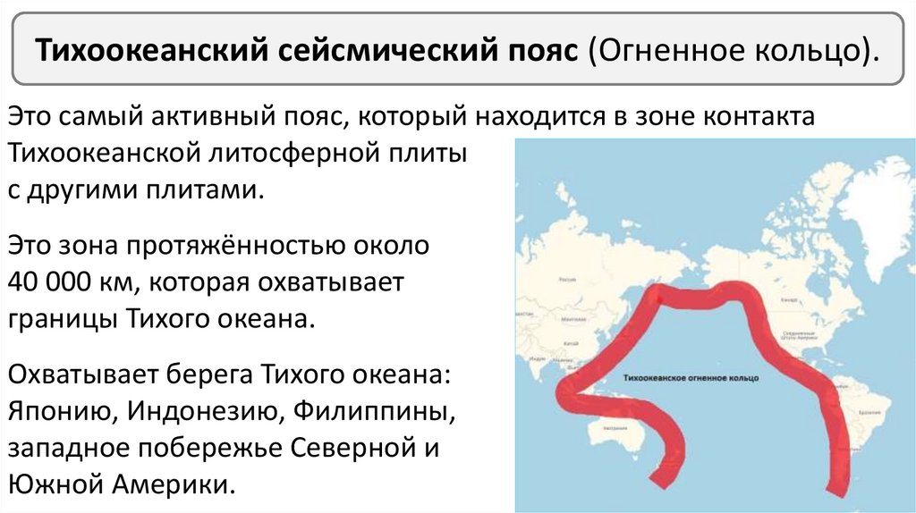 Тихоокеанский сейсмический пояс (Огненное кольцо).Это самый активный пояс, который находится в зоне контакта