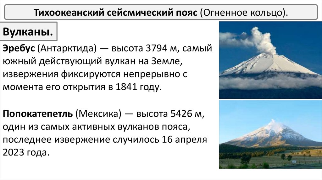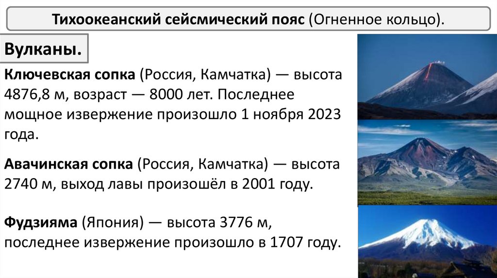 Тихоокеанский сейсмический пояс (Огненное кольцо).Вулканы.
