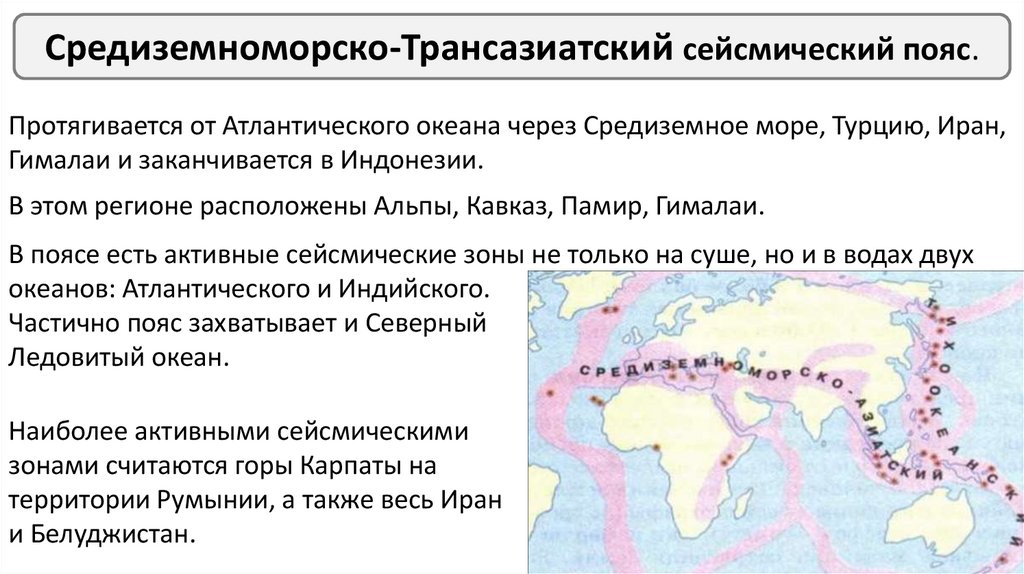 Средиземноморско-Трансазиатский сейсмический пояс.Протягивается от Атлантического океана через Средиземное море, Турцию, Иран,