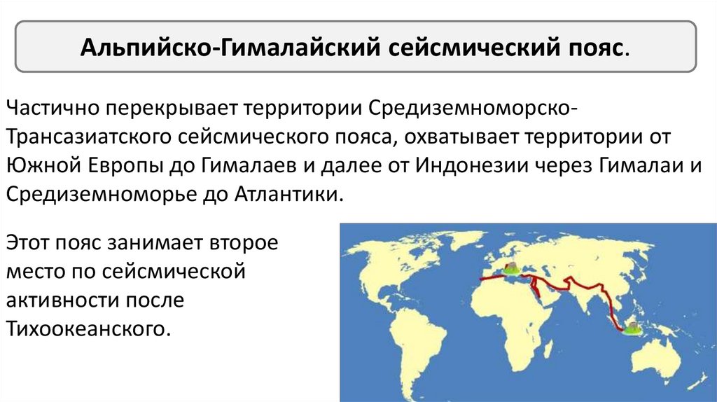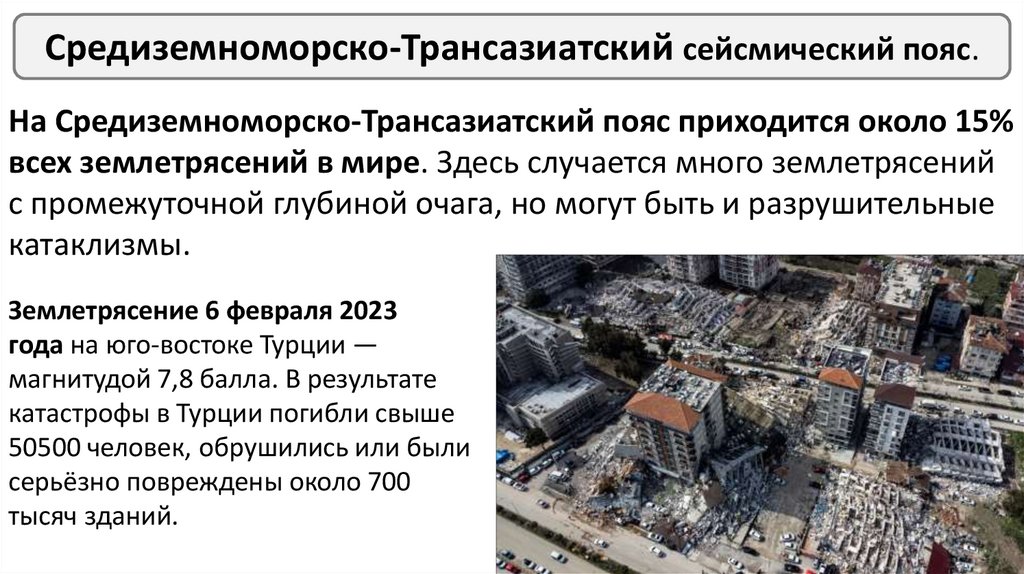 Средиземноморско-Трансазиатский сейсмический пояс.На Средиземноморско-Трансазиатский пояс приходится около 15%
