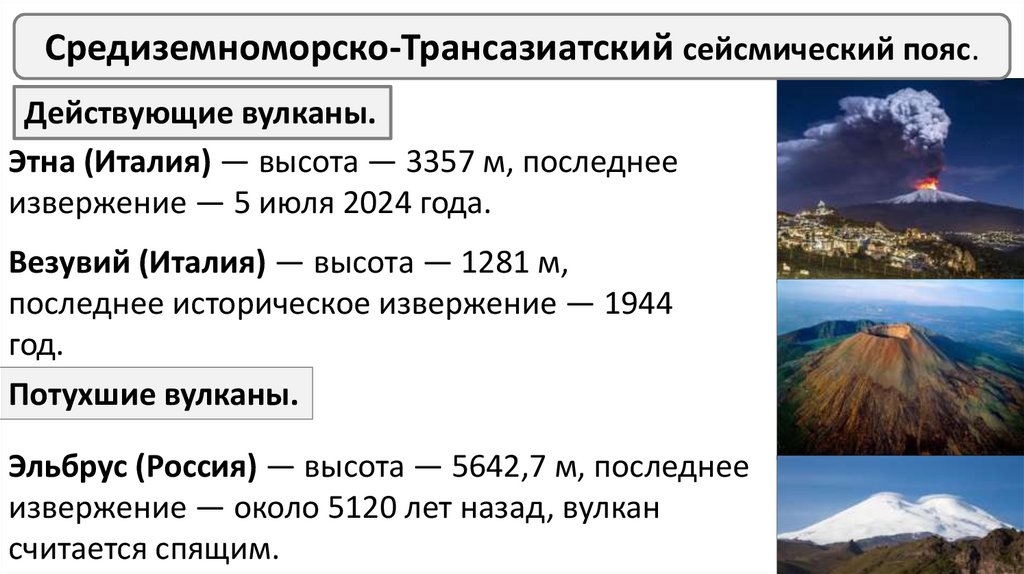 Средиземноморско-Трансазиатский сейсмический пояс.Действующие вулканы.