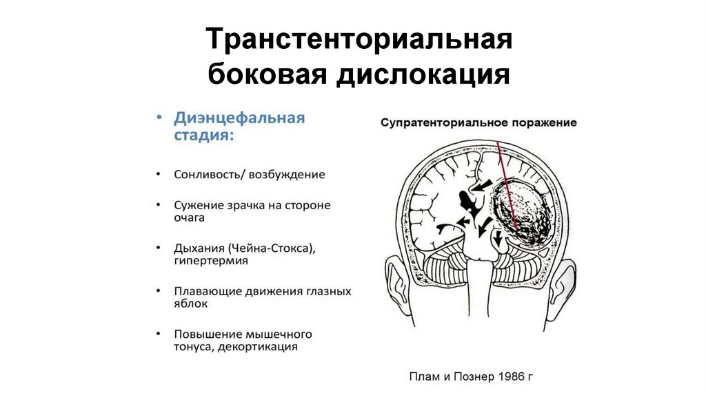 1. Смещение в-ва лобной доли подфалькс (сдавление контрлатеральной ПМА- (subfalcial