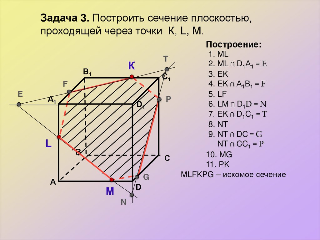 Задача 3. Построить сечение плоскостью,проходящей через точки К, L, М.