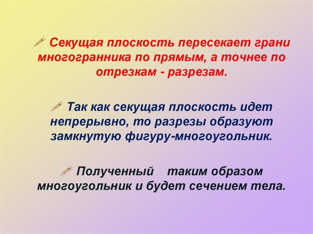• Секущей плоскостью многогранника называется…• Сечением многогранника называется …