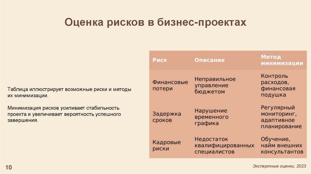 Оценка рисков в бизнес-проектахТаблица иллюстрирует возможные риски и методы