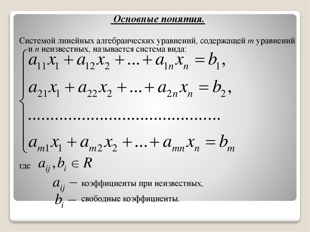 Основные понятия.Системой линейных алгебраических уравнений, содержащей m уравнений
