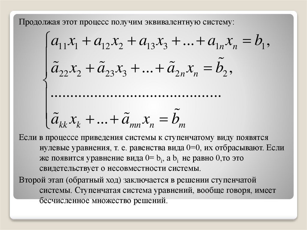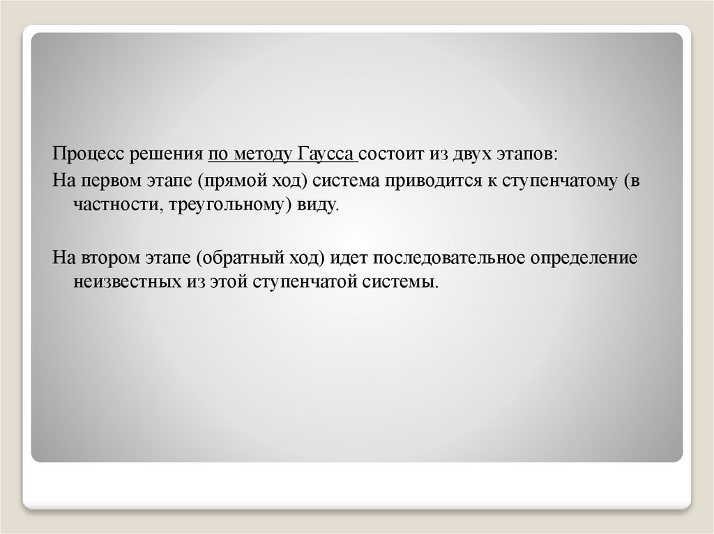 Процесс решения по методу Гаусса состоит из двух этапов:На первом этапе (прямой ход) система приводится к ступенчатому (в
