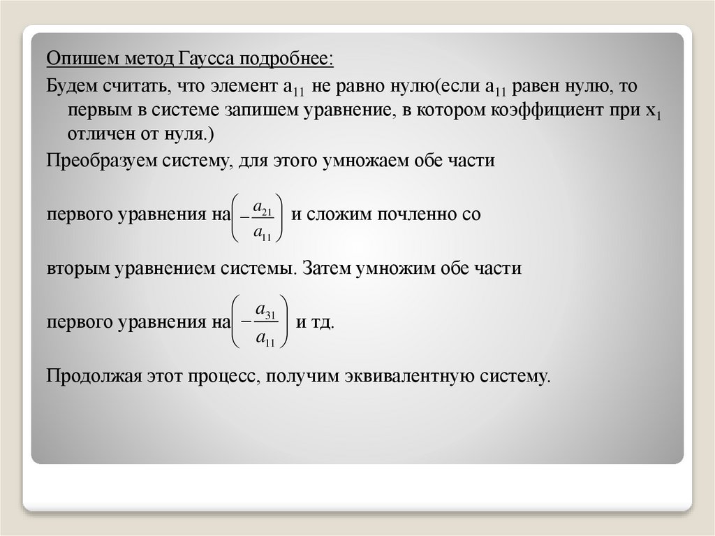 Опишем метод Гаусса подробнее:Будем считать, что элемент а11 не равно нулю(если а11 равен нулю, то