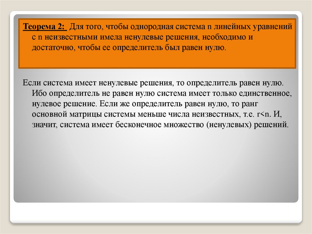 Если система имеет ненулевые решения, то определитель равен нулю.