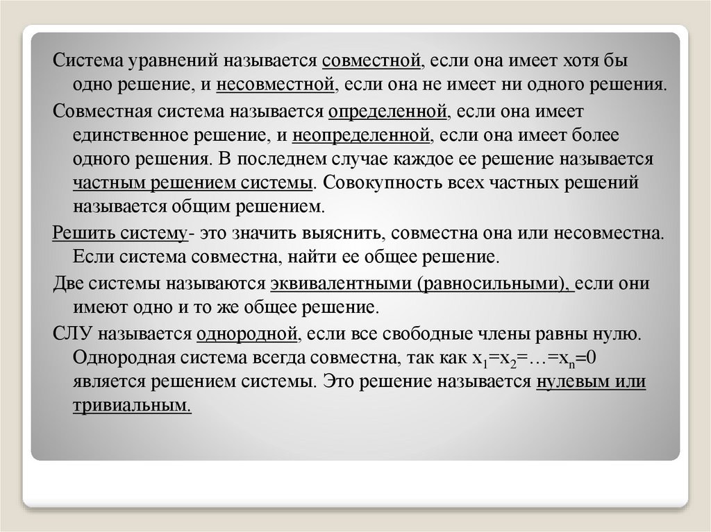 Система уравнений называется совместной, если она имеет хотя быодно решение, и несовместной, если она не имеет ни одного решения.