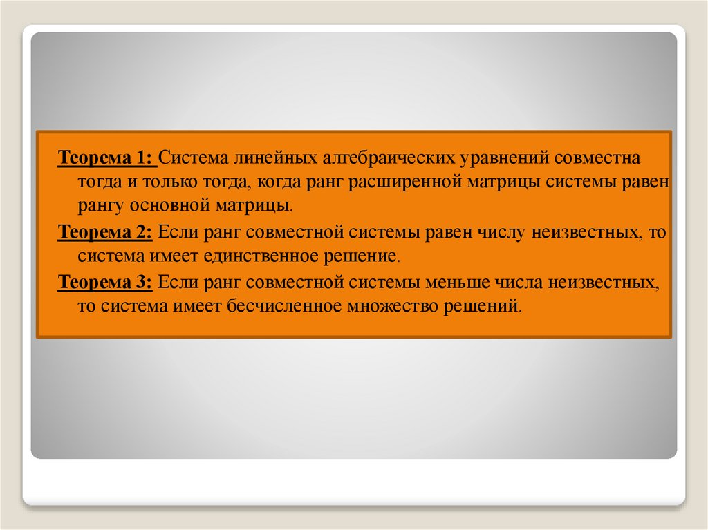 Теорема 1: Система линейных алгебраических уравнений совместнатогда и только тогда, когда ранг расширенной матрицы системы равен