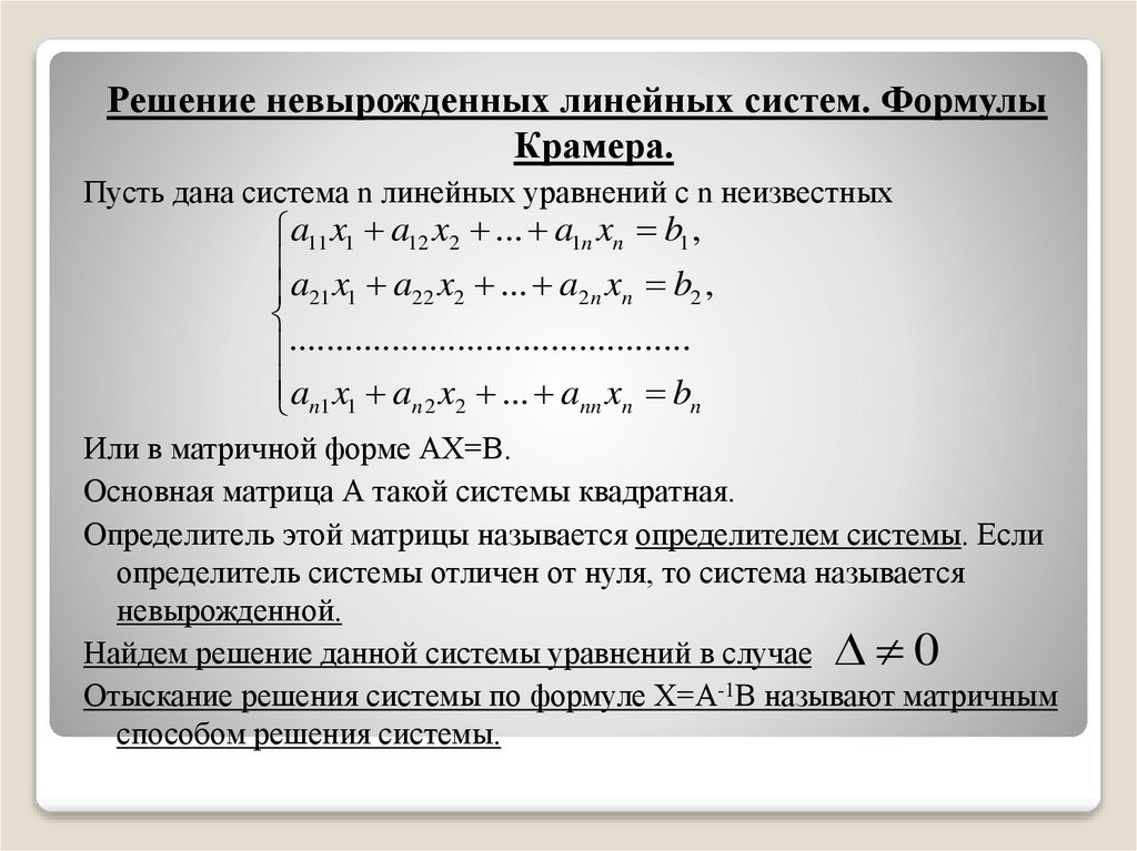 Решение невырожденных линейных систем. ФормулыКрамера.