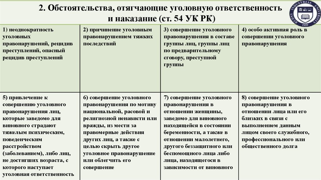 2. Обстоятельства, отягчающие уголовную ответственностьи наказание (ст. 54 УК РК)