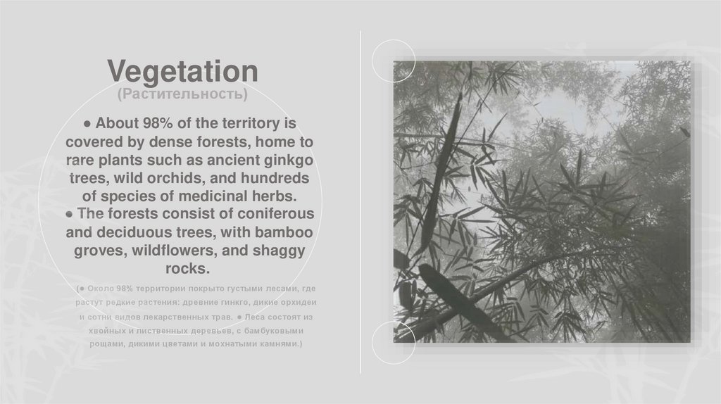 ( ● Около 98% территории покрыто густыми лесами, где