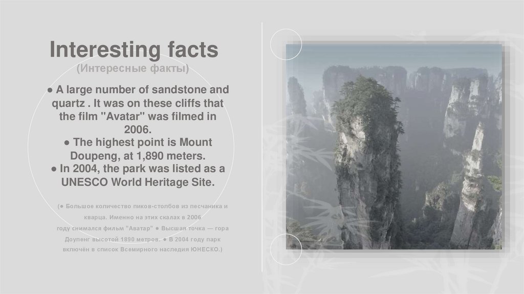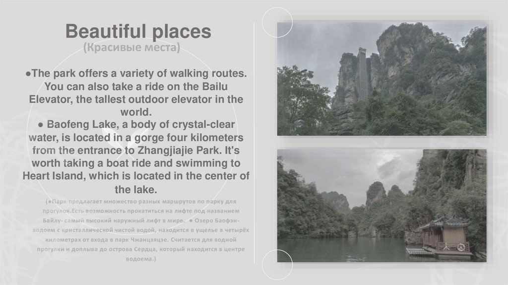 Байлу- самый высокий наружный лифт в мире. ● Озеро Баофэнводоем с кристаллической чистой водой, находится в ущелье в четырёх