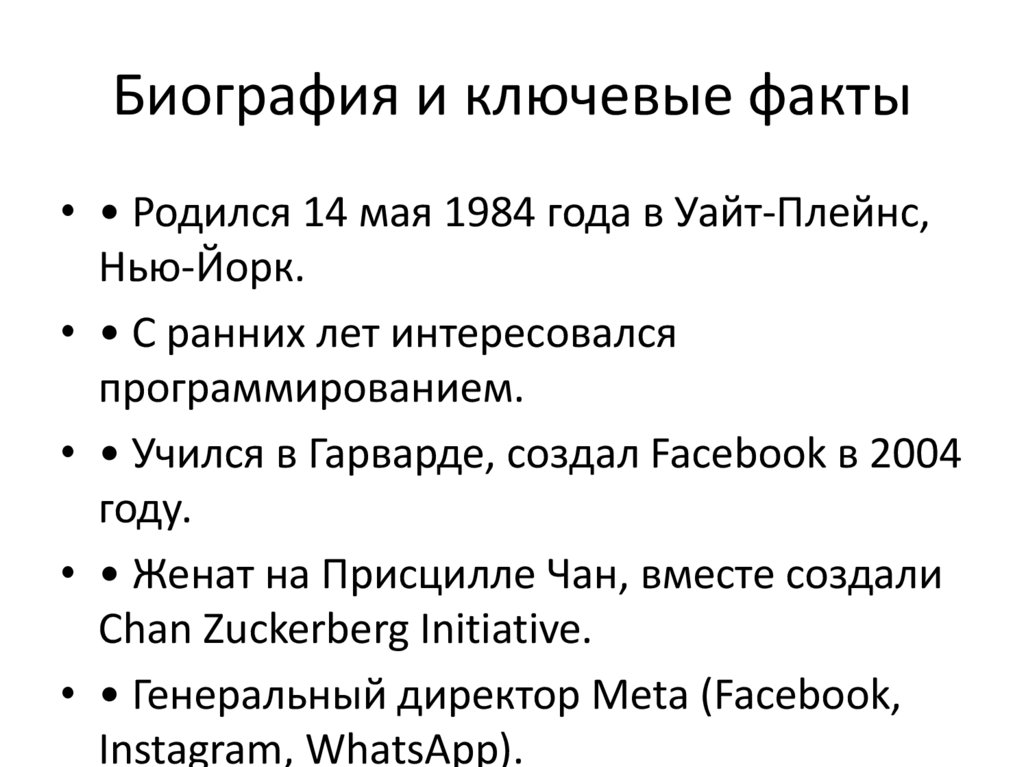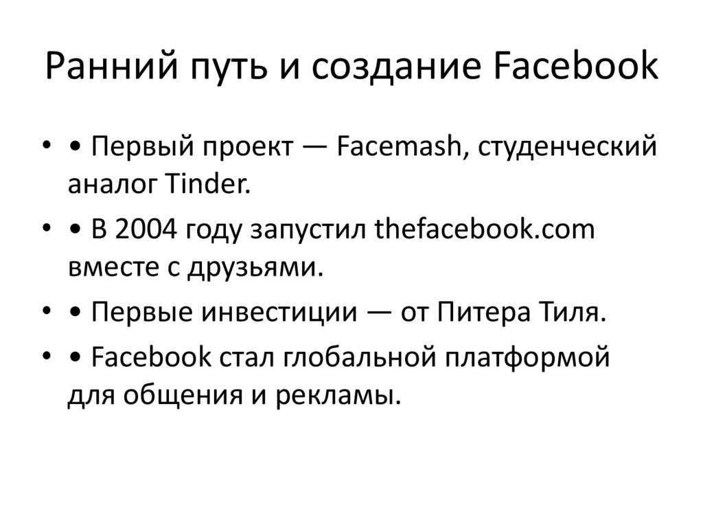 Ранний путь и создание Facebook• • Первый проект — Facemash, студенческий