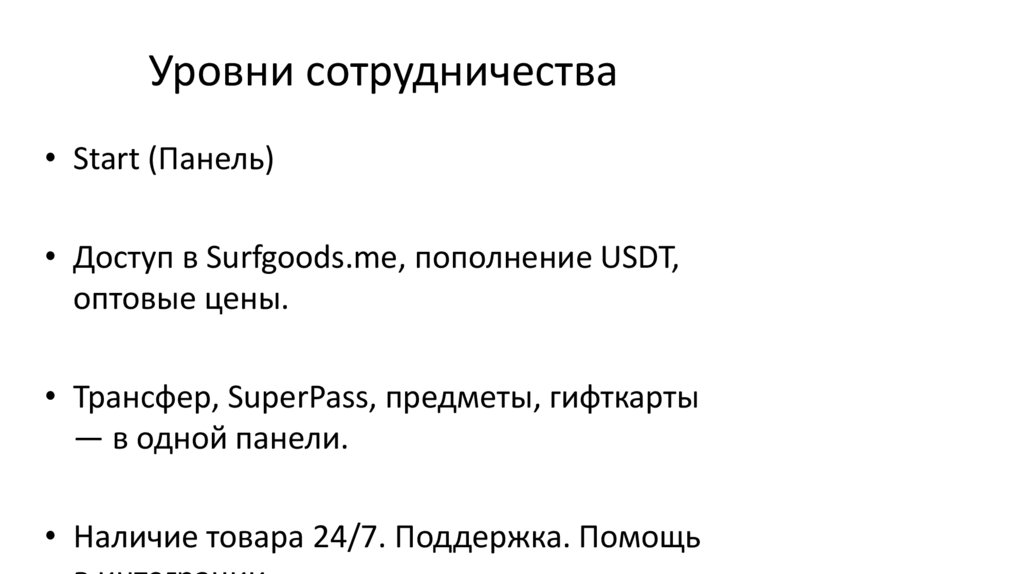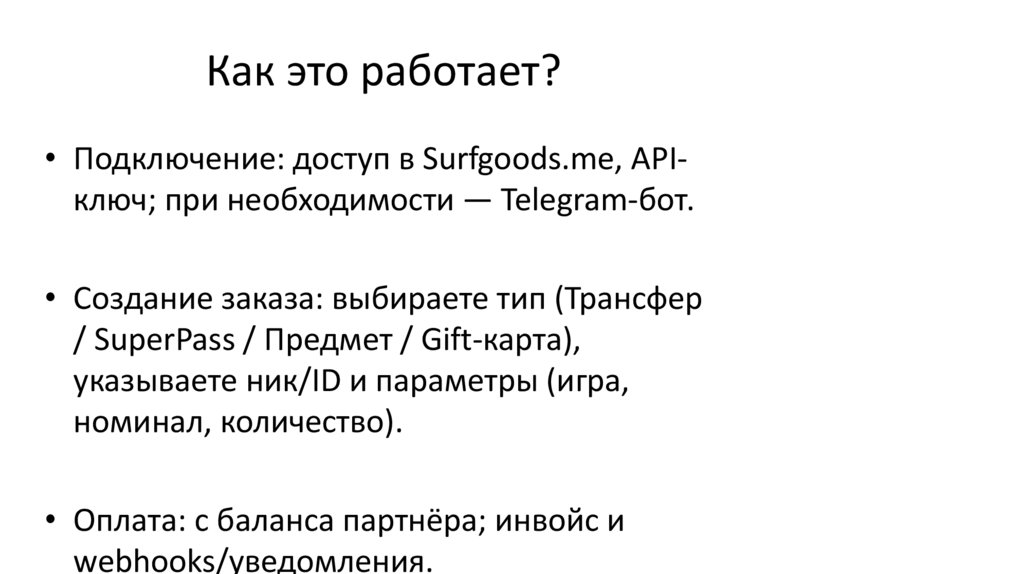 Как это работает?• Подключение: доступ в Surfgoods.me, APIключ; при необходимости — Telegram-бот.