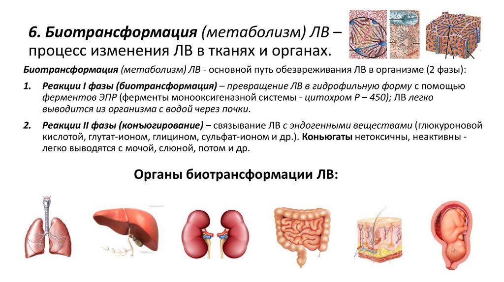 6. Биотрансформация (метаболизм) ЛВ –процесс изменения ЛВ в тканях и органах.
