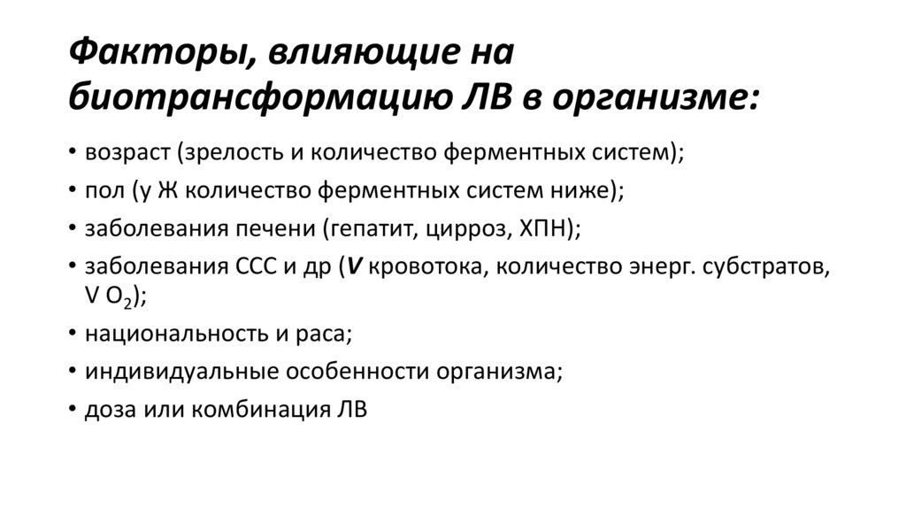 Факторы, влияющие набиотрансформацию ЛВ в организме: