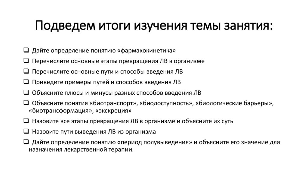 Подведем итоги изучения темы занятия:Дайте определение понятию «фармакокинетика»