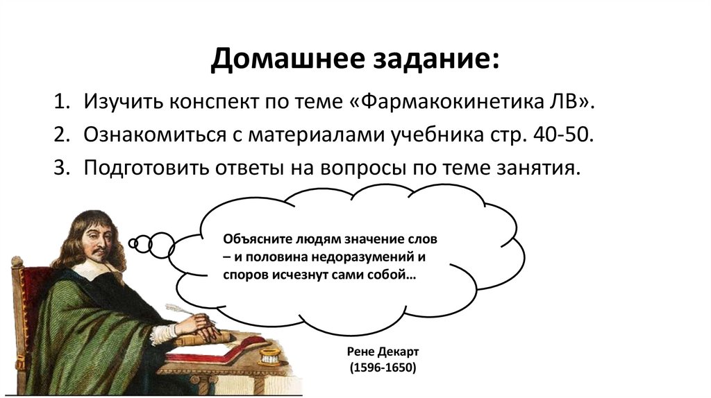 Домашнее задание:1. Изучить конспект по теме «Фармакокинетика ЛВ».