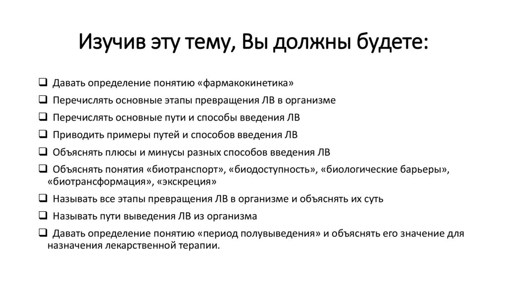 Изучив эту тему, Вы должны будете:Давать определение понятию «фармакокинетика»