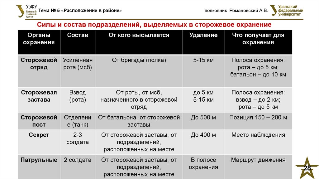 Силы и состав подразделений, выделяемых в сторожевое охранение