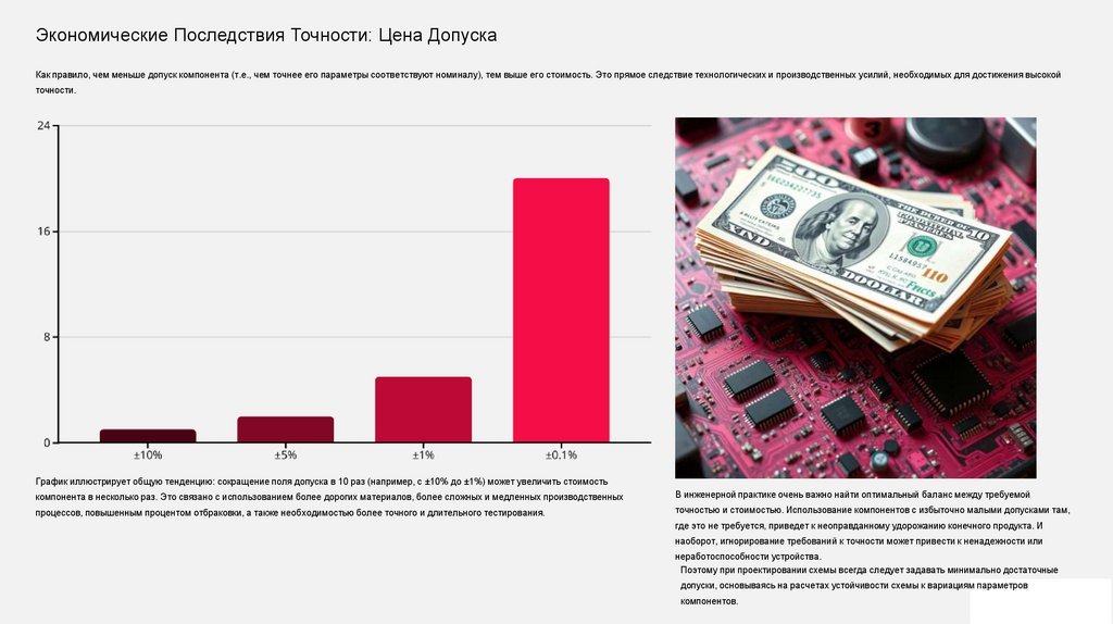 Экономические Последствия Точности: Цена ДопускаКак правило, чем меньше допуск компонента (т.е., чем точнее его параметры соответствуют номиналу), тем выше его стоимость. Это прямое следствие технологических и производственных усилий, необходимых для достижения высокой