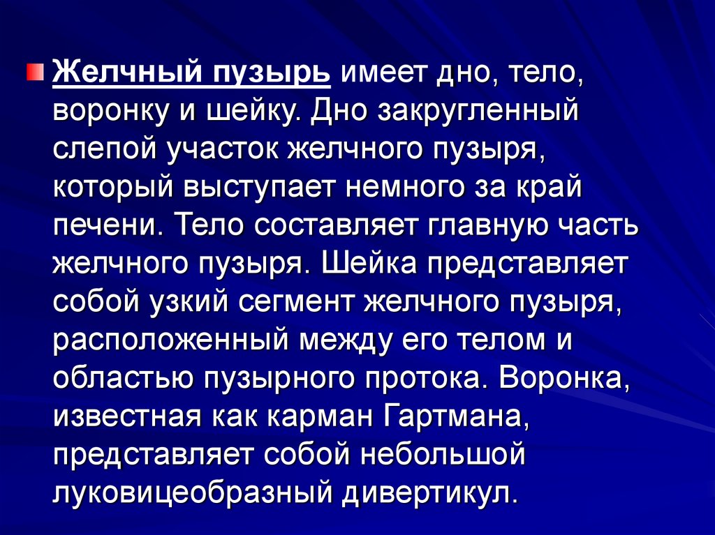 Желчный пузырь имеет дно, тело,воронку и шейку. Дно закругленный