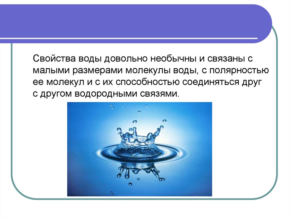 Свойства воды довольно необычны и связаны смалыми размерами молекулы воды, с полярностью
