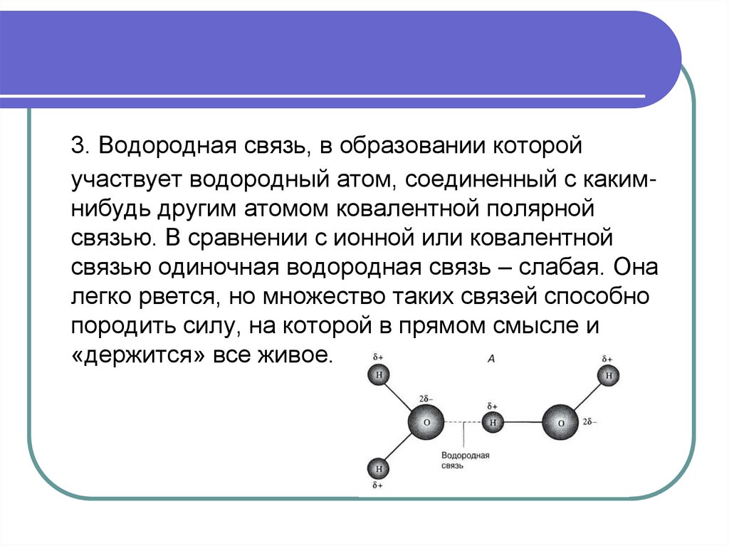 3. Водородная связь, в образовании которойучаствует водородный атом, соединенный с какимнибудь другим атомом ковалентной полярной