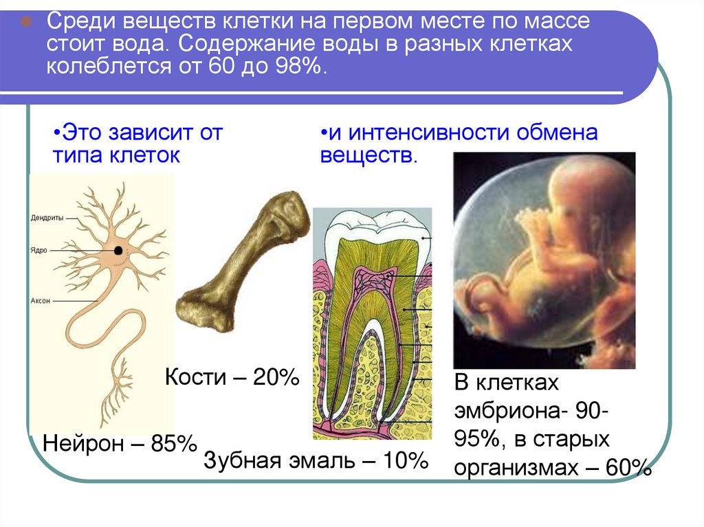 Среди веществ клетки на первом месте по массестоит вода. Содержание воды в разных клетках
