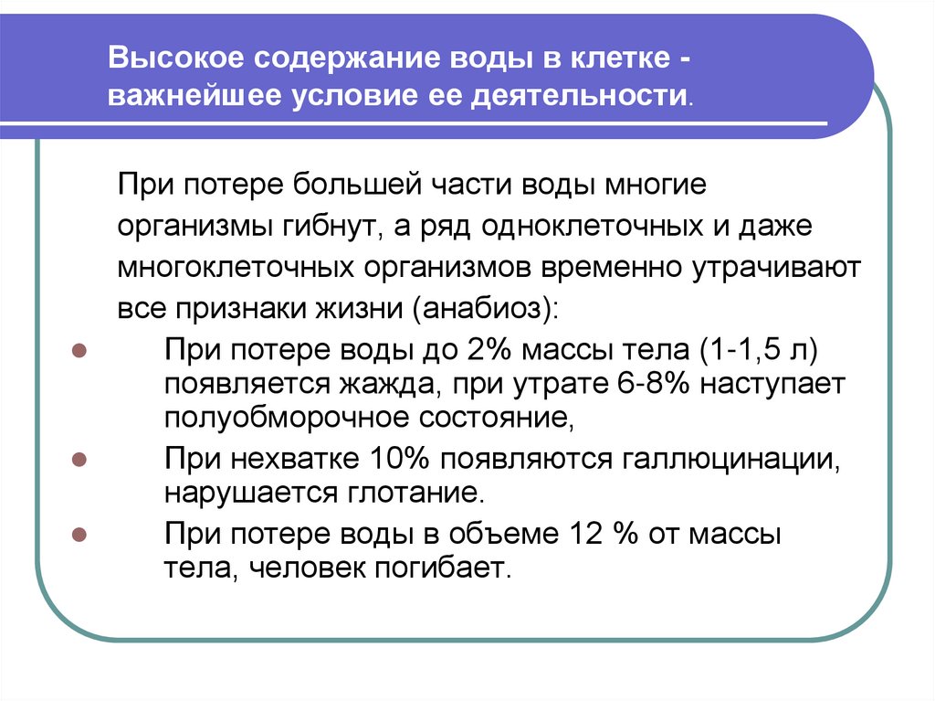 Высокое содержание воды в клетке важнейшее условие ее деятельности.При потере большей части воды многие