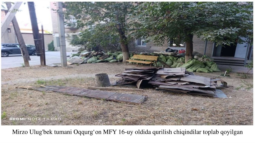 Mirzo Ulug'bek tumani Oqqurg‘on MFY 16-uy oldida qurilish chiqindilar toplab qoyilgan