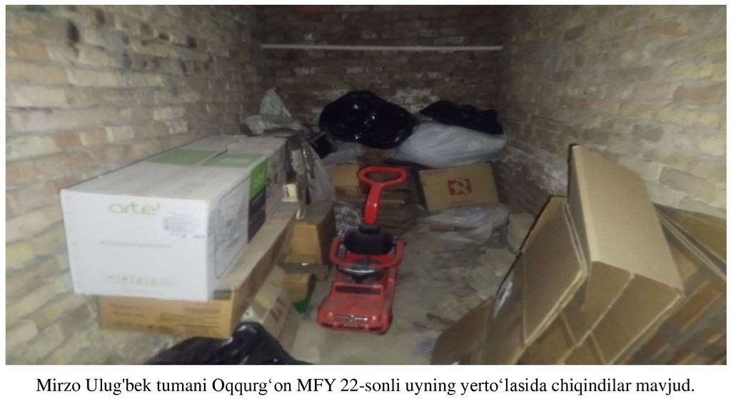 Mirzo Ulug'bek tumani Oqqurg‘on MFY 22-sonli uyning yerto‘lasida chiqindilar mavjud.
